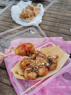港にフードトラックが沢山テントも沢山。マーケットは、行列ができている所が人気とわかるので